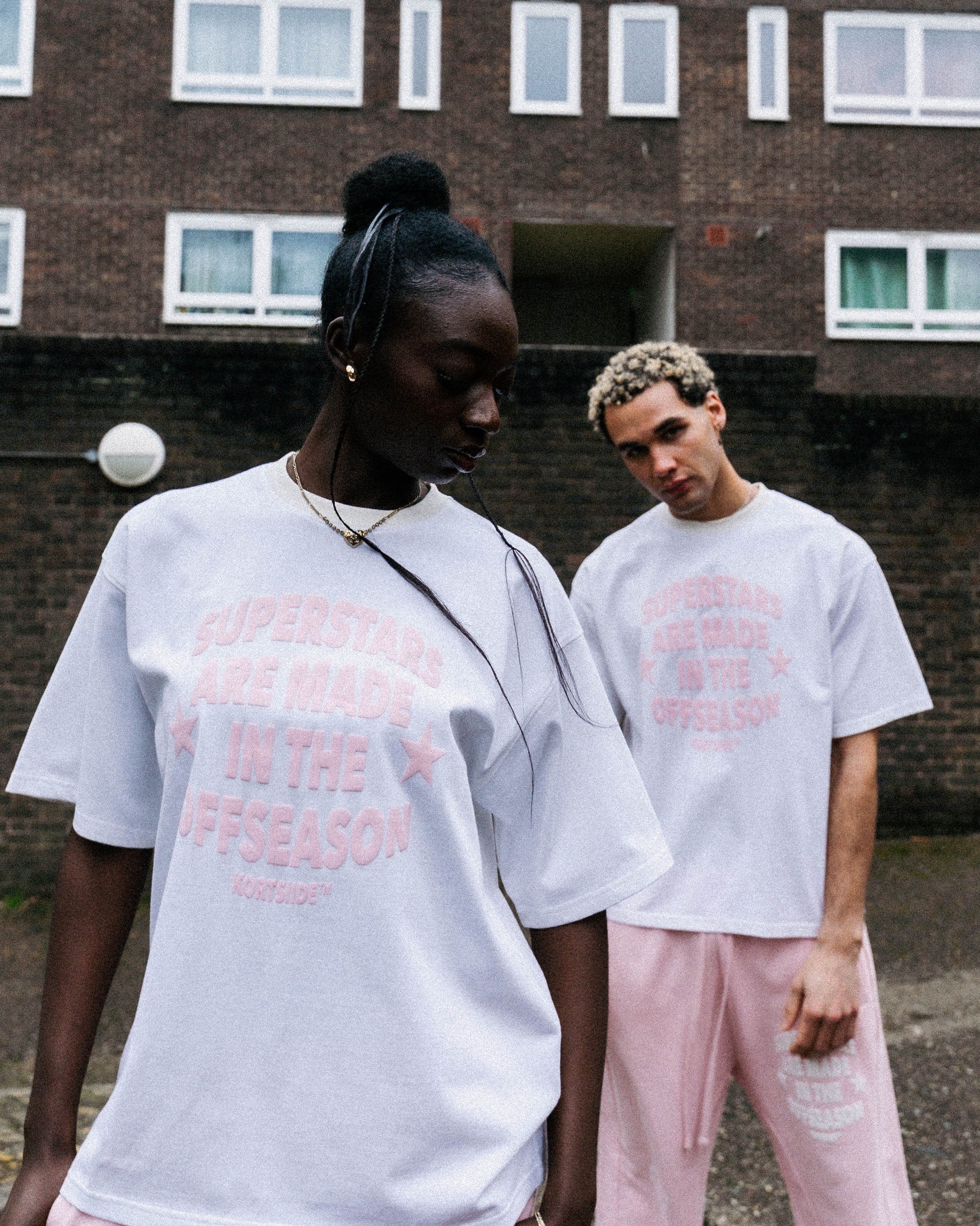 The New Classic Superstar Tshirt in White/Cloud Pink. Cut from 220gsm 100% cotton. Our signature Tshirt, perfect for everyday with a slight oversized fit, featuring our Superstar Logo in cloud pink.