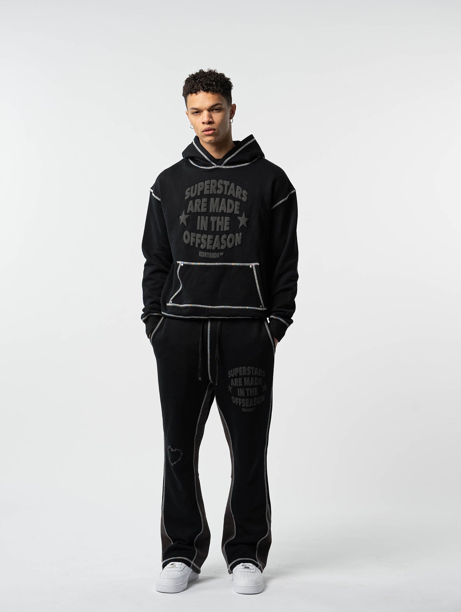 The Triple Black Superstar Set is our most iconic tracksuit. The original flared set that redefined the market. The hoodie features our classic Superstar artwork on the chest, paired with perfectly cut flared joggers that deliver a defined yet relaxed silhouette.